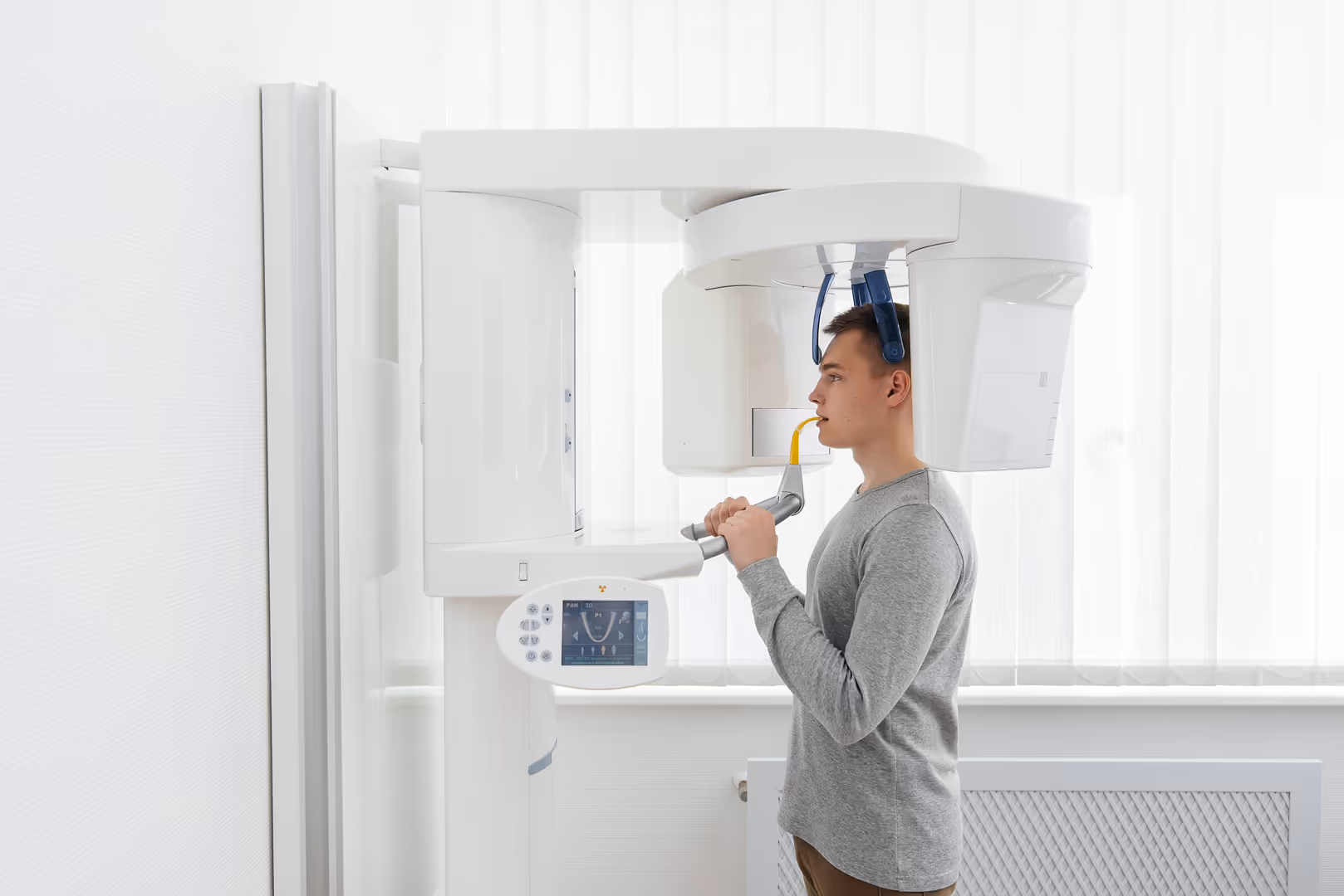 The CT scan takes just a few minutes in our office. One of our professionally trained staff members will place a lead apron over your body. This is designed to protect you against radiation while it is in use. You will then stand in the middle of a circular machine and either bite on a small bite guard or rest your chin. The machine will then circle your head completely while it takes the image. The image is available to us for immediate review so that we can begin the treatment planning specific to your needs.